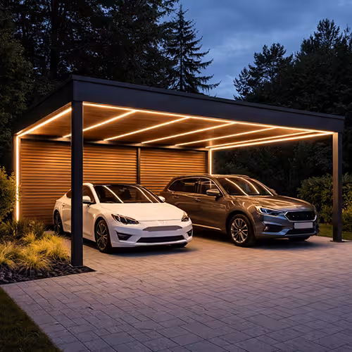 Un'illuminazione sofisticata trasforma la pensilina in un'area funzionale e invitante. Potrete parcheggiare in modo più rilassato, muovervi con maggiore sicurezza e valorizzare visivamente la vostra proprietà.